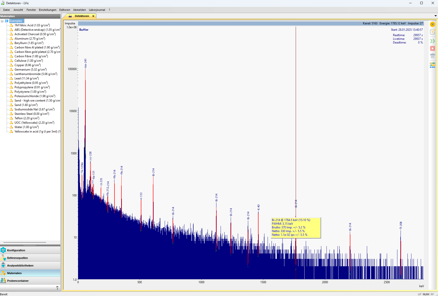 Gamma-Spektrum einer Uran-Probe dargestellt im kommerziellen Gamma-Spektrometrieprogramm LVis der Fa. Ortec. Die identifizierten Peaks von Uran und Nukliden der zugehörigen Zerfallsreihen sind rot eingezeichnet. Im linken Fenster sind definierte Materialien für die Verwendung in der Auswertung aufgelistet.