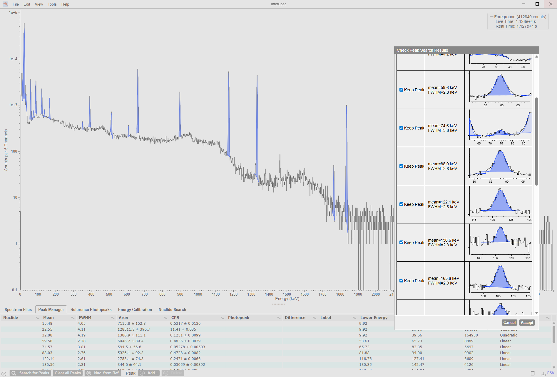Gamma-Spektrum einer QCY-Probe, einer Mischung verschiedener Radionuklide für Kalibrationsmessungen, dargestellt mit dem unter der LGPL-2.1 Lizenz erhältlichen Gammma-Spektrometrieprogramm InterSpec. Dargestellt ist das Spektrum mit automatisch identifizierten Nukliden sowie einem Auswahlfenster für die Übernahme der Ergebnisse. Im unteren Bereich wird der Peak-Manager gezeigt.