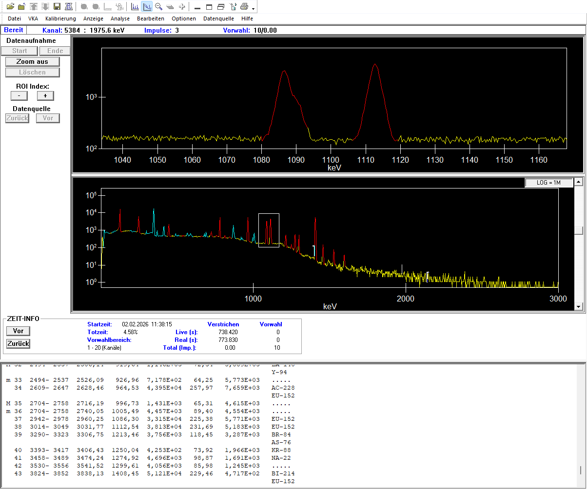 Gamma-Spektrum einer 152Eu-Probe dargestellt im kommerziellen Gammma-Spektrometrieprogramm Genie 2000 der Fa. Mirion. Das obere Spektrum ist ein vergrößerter Teilausschnitt des darunter abgebildeten Gesamtspektrums (weißer Kasten). Die identifizierten Peaks sind rot in den beiden Spektren eingezeichnet, ihre Daten im Report unter den Spektren aufgelistet.