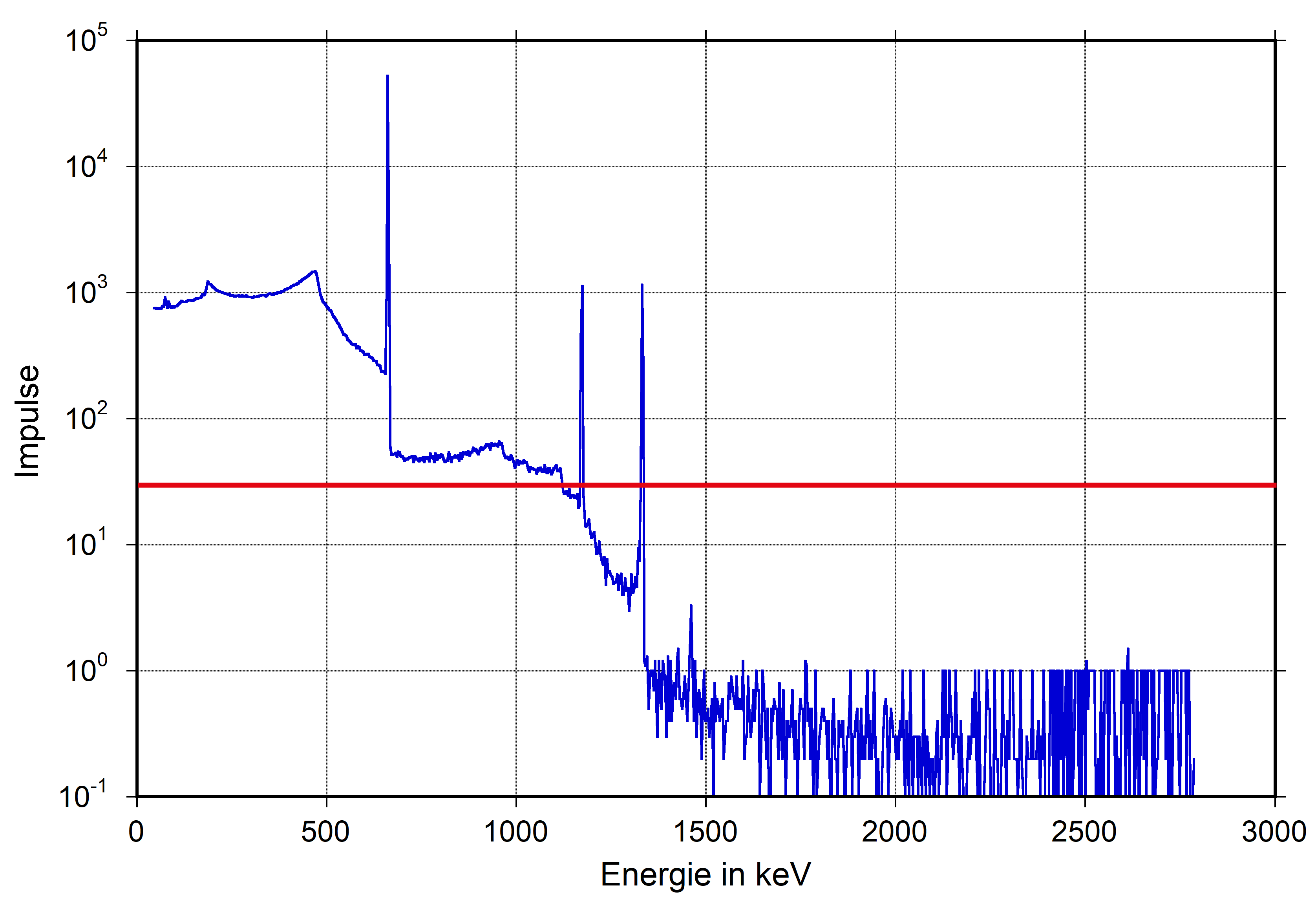 Sie benötigen offensichtlich noch ein paar Hilfestellungen um das Diagramm zu verstehen. Betrachten Sie das nachfolgende Diagramm. Die waagerechten roten Linien würden Ihrer Antwort entsprechen, dass „alle Energiewerte die gleiche Anzahl an Impulsen haben“. Die blaue Linie zeigt aber alles andere als einen waagerechten Verlauf, d. h. die Impulswerte ändern sich mit den Energiewerten.