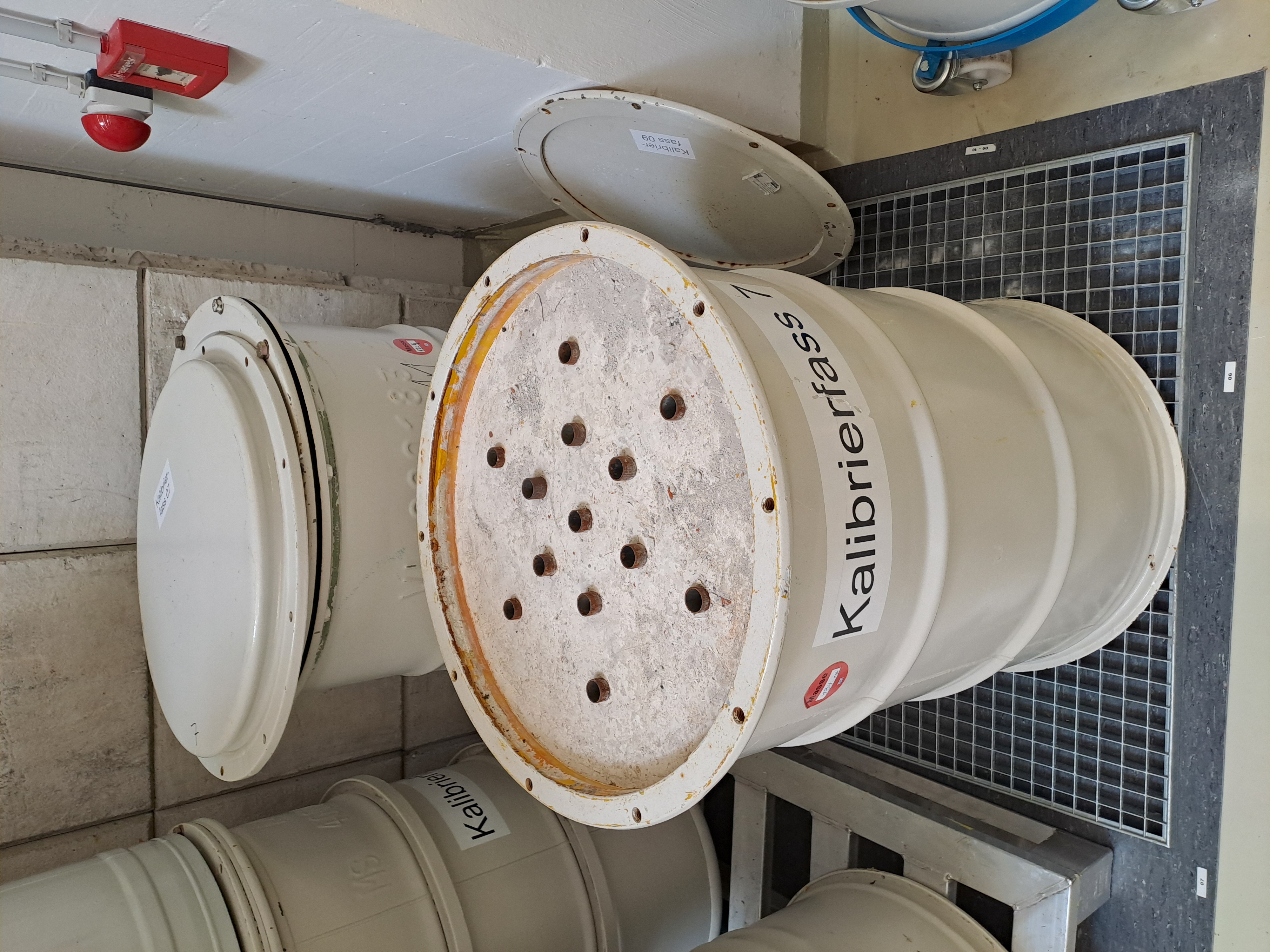 200 L Kalibierfass mit einer Zementmatrix. In die Zementmatrix sind 13 vertikale Rohre eingebracht, die zur Aufnahme von radioaktiven Kalibrationsquellen dienen.