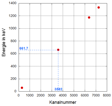 Die gestrichelten Linien zeigen beispielhaft, wie der Punkt für die Gamma-Energie bei 661,7 keV und der zugehörigen Kanalnummer 3582 bestimmt wird: zuerst zeichnet man eine waagerechte Linie (grün gestrichelt), welche die Energieachse (senkrechte Achse) bei 661,7 keV schneidet, dann eine senkrechte Linie (blau gestrichelt), welche die Kanalnummernachse (waagerechte Achse) bei dem Wert 3582 schneidet. Der Schnittpunkt der beiden gestrichelten Achsen ist der gesucht Punkt (rot markiert). Entsprechend kann man die weiteren Punkte erzeugen.
