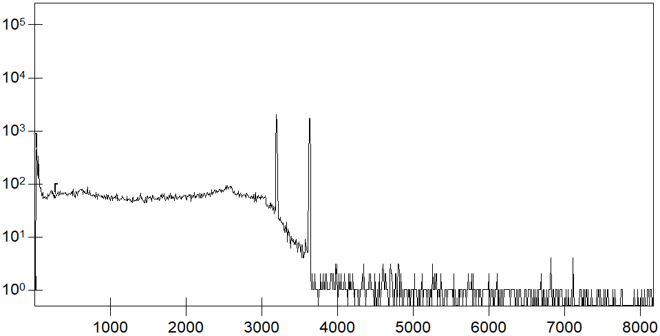 Beispiel eines Gamma-Spektrums. Dargestellt ist die Häufigkeit mit der die einer Kanalnummer entsprechende Energie der Gamma-Strahlung im Detektor registriert wurde.