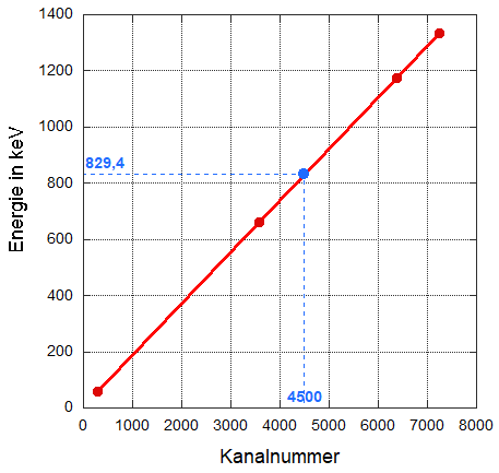 Wenn Sie nun in einem gemessenen Spektrum eine charakteristische Linie „sehen“, dann bestimmen Sie deren Kanalnummer und ermitteln mit Hilfe des Diagramms die zugehörige Energie. Im nachfolgenden Diagramm ist dies für die Kanalnummer 4500 gezeigt. Es wird dieser eine Energie von 829,4 keV zugeordnet.